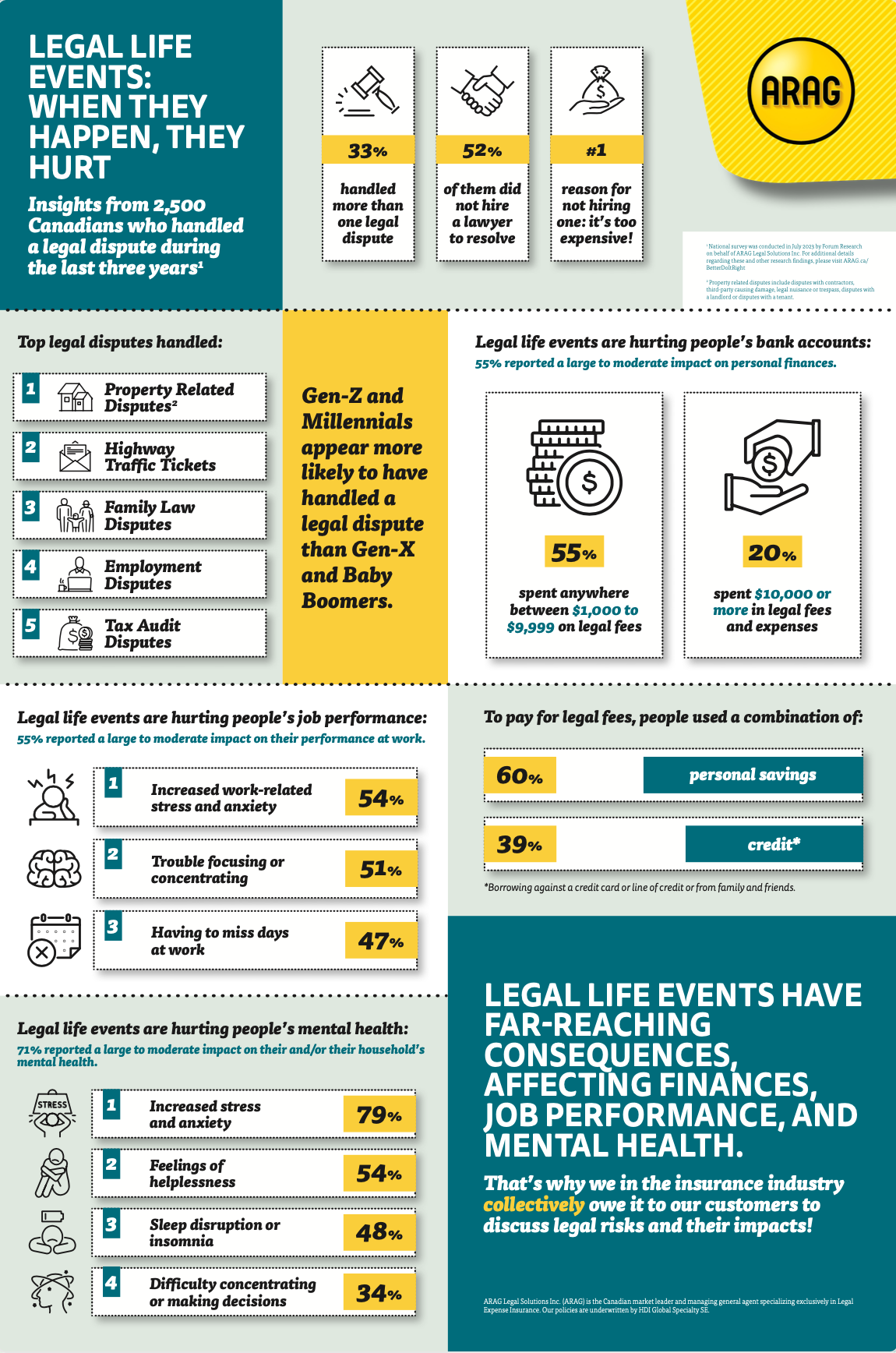 Yet, what often remains absent from news headlines are the challenges people encounter when navigating legal disputes, whether they have the assistance of a lawyer or not. This was a sentiment echoed by over 2,500 Canadians who responded to a national survey in July 2023. The survey, conducted by Forum Research on behalf of ARAG Legal Solutions Inc., highlighted the prevalence and impact of these legal issues.